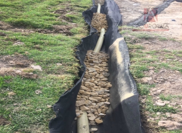 Excavación en zona verde contaminada de aguas residuales con construcción de sistema de drenaje mediante filtro francés.